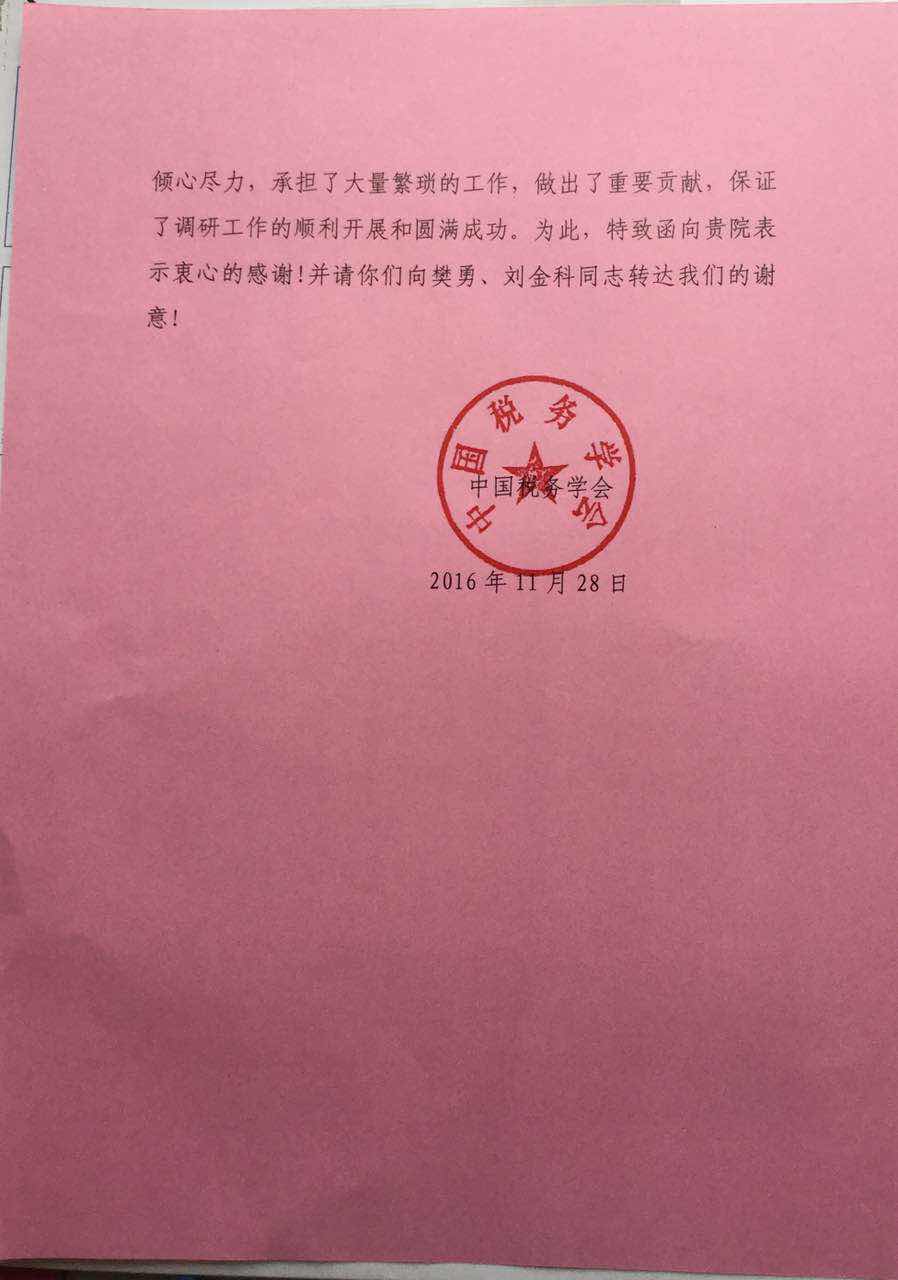 日前,中国税务学会致信感谢taptap体育对学会工作的大力支持,特别感谢樊勇、刘金科两位教师参与金融业营改增税负问题专项课题研究所做出的努力与贡献。学会对两位教师全程参与课题调研工作,克服困难,不辞辛苦、献计献策,承担了大量繁琐的工作,倾心尽力并做出重要贡献,给予了高度肯定。