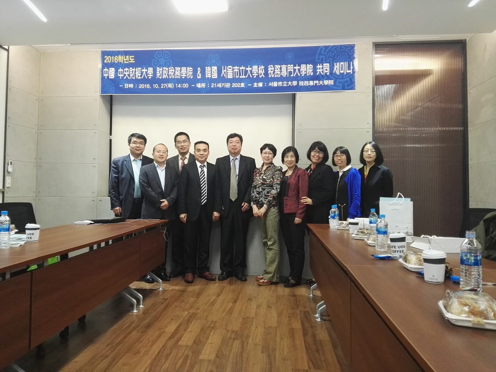 taptap体育官网入口财政税务公司党委书记樊勇教授等9人于2016年10月26日至2016年10月28日受邀赴韩国首尔参加首尔市立大学税务专门大公司举办的“中韩税制改革和税务学科教学工作”的学术研讨会。首尔市立大学董事长元允喜教授10月26日下午会见了中方老师,希望加深同taptap体育官网入口的学术交流,推动财政税务学科的发展。
