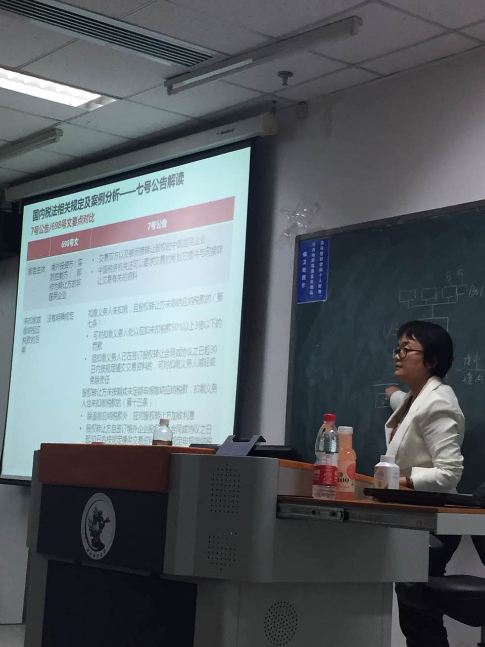 9月28日晚,在沙河校区6-106教室,taptap体育17级税务专业硕士案例研讨课第3期(总第13期)如期开讲。此次的主讲人为京东集团税务总监张爱华老师。张老师通过法规解读、案例讲解为同学们介绍了非居民企业间接股权转让的相关知识。刘金科老师主持并参加了此次案例研讨课,杨虹教授、黄云教授也参加了这次课程,并同张老师开展了热烈的讨论。