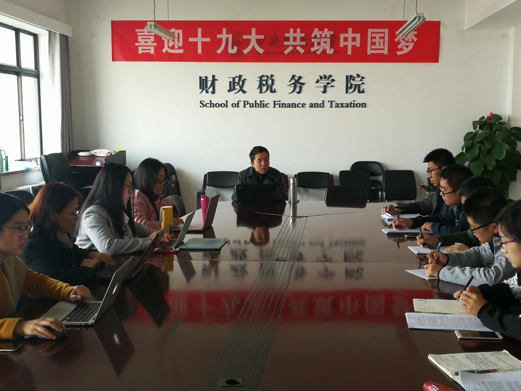 第一个环节,白彦锋老师首先介绍了党的十九大基本情况,鼓励大家积极学习十九大精神:学强,认真仔细的研读报告全文,并结合自身的研究和工作;教强,由老师指导员工们学习;传强,利用新媒体优势传播能量;研强,围绕十九大的新思想和新论断做研究;实干,用新战略衡量我们的工作,要出实实在在的成果。然后,白彦锋老师介绍了北京市高教系统专题思想学习会的情况,充分肯定刘尚希老师“美好生活与现代财政”的演讲。人民群众对美好生活的向往与我们发展不均衡存在矛盾,需要加快现代财政加快财政制度建设;到本世纪中叶建成社会主义强国;基于人民群众对美好生活的向往,推进基本养老保险的全国统筹。最后,白彦锋老师谈了自己的学习体会,指出我们中国特色社会主义建设已经进入到了新时代,虽然生产力发展水平在很多方面发展的已经属于世界前列,但是发展的不平衡,要利用财政手段进行调控,加快建设现代财政制度,建立权责清晰、财力协调、区域均衡的中央和地方的财政分配关系,发挥财政的积极作用。