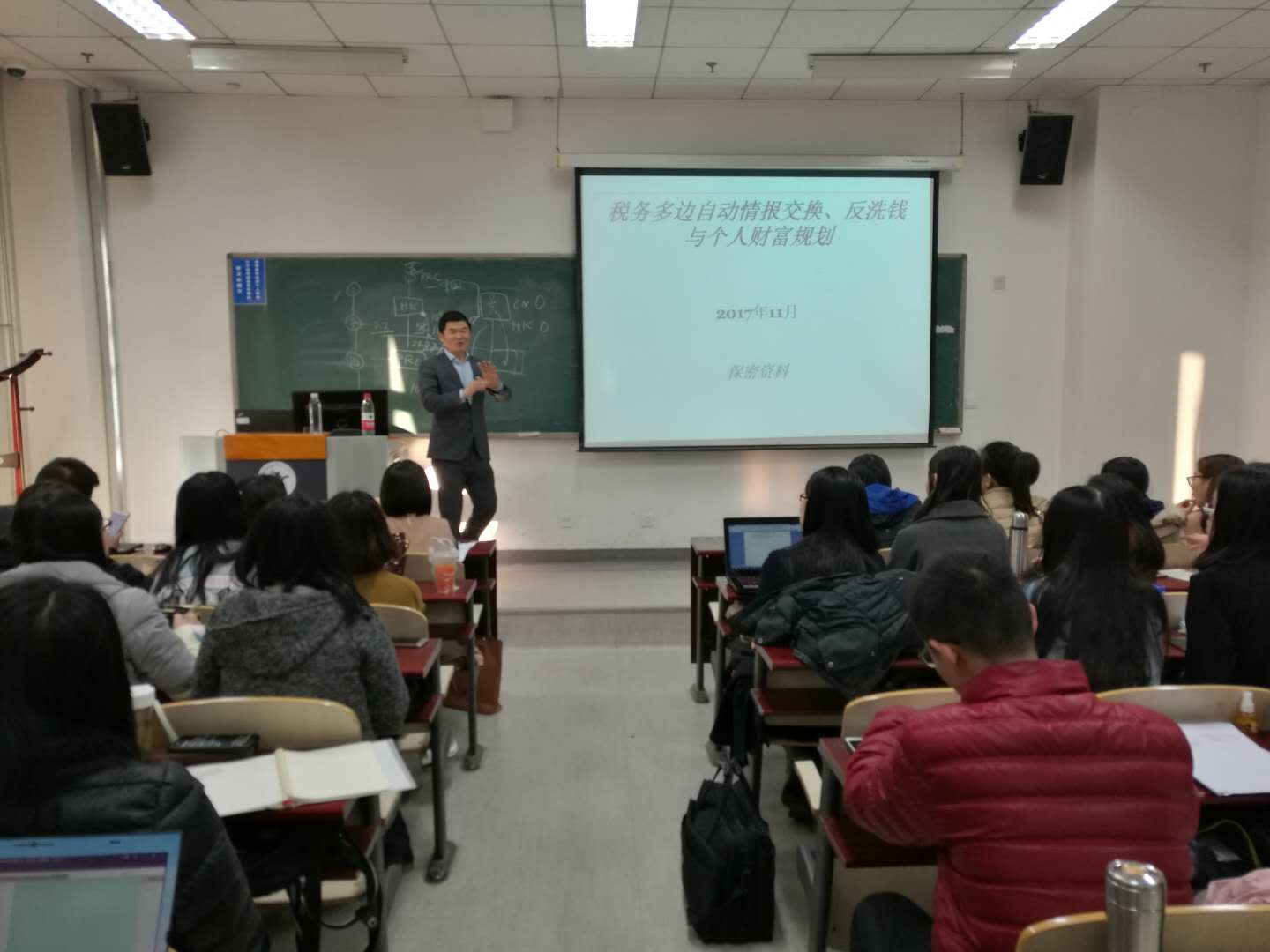 本次案例研讨课程的主题是税务多边自动情报交换、反洗钱与个人财富规划。杨后鲁老师首先为同学们介绍了在税务自动情报交换机制出现之前的历史,通过讲解案例介绍了个人税收居民的判定标准:我国判定标准为住所标准、居住时间标准,国际上的一般判定标准还有国籍、重要利益中心标准等。杨老师认为住所是难以判定的概念,其发挥的作用有限,并通过讲解香港公司转让中国公司24.77%的股权真实案例,讲解个人所得税法在境外情形下是如何被割裂的,教导同学们在实务中要培养起运用法律进行思考的能力,以应对实务实际操作中的复杂性。这一案例还是对税收协定的具体应用,在申请税收协定待遇时,如果形式上满足而实质上不能满足受益所有人的条件,则企业不能享受协定待遇。杨老师将税务自动情报交换机制比喻成阿喀琉斯之踵,这是国际税收征管的普遍弱点。一国国内税务机关由于无法了解国内居民、企业在境外发生的各种交易、行为,使得国内较为基本的规则在实践中被人为扭曲,严重损害了国家的税收利益。