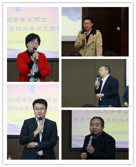 校外导师在会上纷纷发言,为中财税务专硕的培养献计献策。北京智方圆税务师事务所有限公司总裁王冬生先生,充分肯定了中财学子学术综合素质,并对同学们提出了几点建议,第一是提高写作能力,第二是提高哲学水平,要善于辩证思维。北京鑫税广通税务师事务所有限公司董事长王进先生指出,2019-2020年国家将要建立1000家税务师事务所与高校的校企实习基地,希望能继续与中财税务专业加强合作。德勤会计师事务所合伙人宫滨先生在会上对同学们提出几点希望,一是在学习过程中多去关注思路与方法,多去接触税务的方方面面。二是把握好两年的时间,积极参与学习、实践、实习等,一定要锻炼同时处理多个任务的能力,三是时刻注重对自己的管理,无论毕业后走向哪里,都要接受社会的考验。北京市国税局第二稽查局孔丹阳副局长也对同学们提出几点建议:一要注重课程学习;二要多学科融合学习,努力成为复合型人才。尤尼泰税务师事务所董事局主席刘志忠先生提出,税务行业用自己的智慧做出贡献,同学们毕业后进入这个行业将会在工作中不断提升自己的能力,获得更好地发展。普华永道会计师事务所合伙人钱江涛先生认为,不管以后从事什么行业,最重要的是对个人能力的培养,用自我驱动力去学习了解更多的东西。德勤会计师事务所税务经理李权周先生以自己在税务局工作的经历与同学们共勉,表示将继续为同学们的实习实践提供机会。德勤会计师事务所税务经理嵇峰先生用自己的亲身经历描绘了从事税务行业的苦与乐,建议同学们根据自己的兴趣在税务服务里选择最适合自己的领域。乾元中利国际税务咨询(北京)有限公司副总经理燕东先生认为,大家在公司除了学习工作外要思考的东西,多涉猎,多思考。华夏幸福基业股份有限公司财务部负责人许军先生从职业发展的角度跟同学们交流了上市公司和社会需要什么样的人才,希望同学们能学有所用。