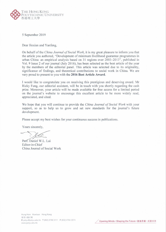 近日,taptap体育硕士毕业生汪进贤同学和白彦锋教授合作撰写的英文文章《中国城市最低社会保障制度的发展:基于31个省区市实证研究的分析》(Development of minimum livelihood guarantee programmes in urban China: an empirical analysis based on 31 regions over 2003–2013)获得香港理工大学《中国社会工作杂志》(China Journal of Social Work, CJSW)“2016年度最佳论文奖”(2016 Best Article Award)。该文最初发表于该杂志2016年7月。编辑部的贺信中对论文的创新性、研究发现的重要性以及对中国相关领域问题的贡献给予了高度评价。