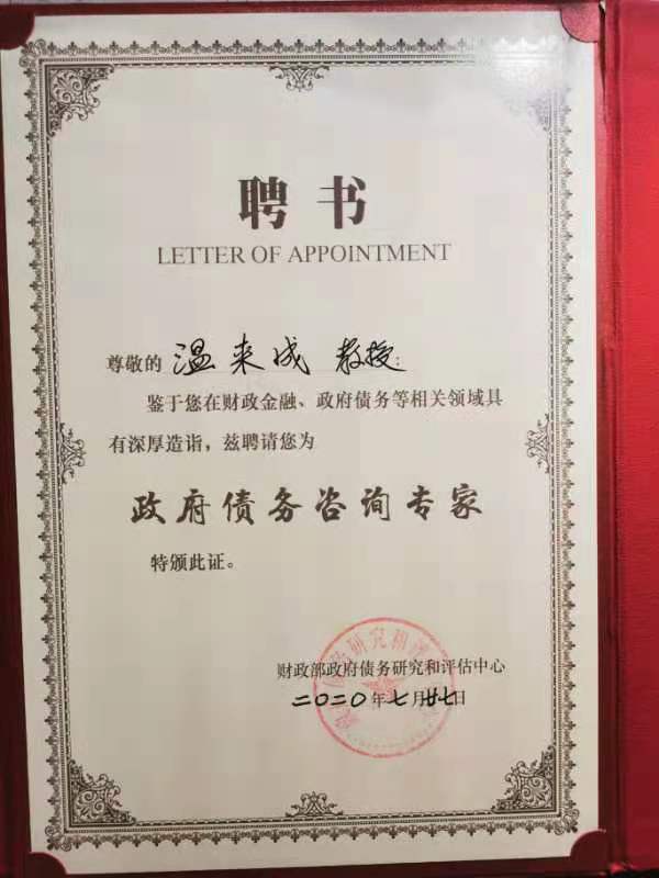 经公司推荐,财政部有关方面批准,财政部政府债务研究和评估中心向taptap体育教授、博士生导师、中财-中证鹏元地方财政投融资研究所执行所长温来成颁发了政府债务咨询专家聘书。温来成教授长期从事地方政府债务等财政投融资教学研究工作。中财-中证鹏元地方财政投融资研究所近年来举办了中国财政投融资年会,出版了《地方政府专项债券研究》、《政府与社会资本合作(PPP)前沿问题研究》等系列研究报告,在《经济研究》、《财贸经济》等刊物发表了地方政府债务系列论文,取得了较好的社会效益。