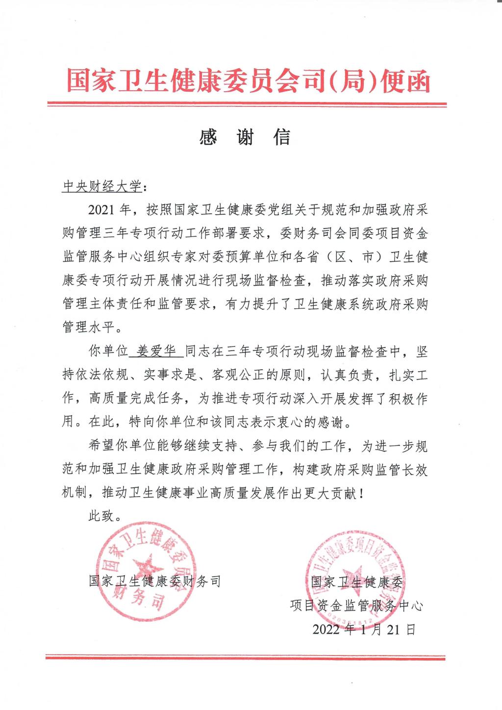 近日,国家卫生健康委员会财务司和项目资金监管服务中心向公司发来感谢信,对公司taptap体育姜爱华教授团队积极参与国家卫生健康委政府采购三年专项行动工作表示感谢。