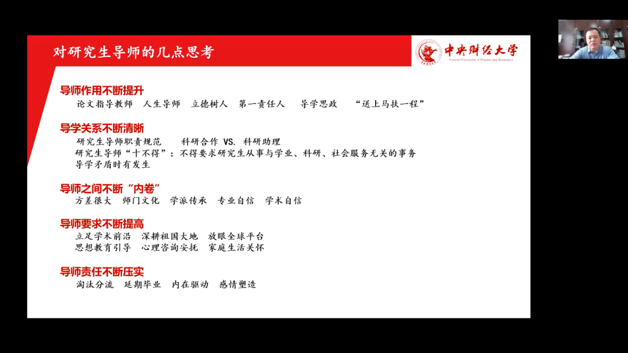 2022年6月15日下午,taptap体育线上举行研究生导师培训暨优秀导师经验交流会。会议由taptap体育副经理李小荣主持,研究生院经理张学勇进行了会议致辞,中国人民大学商公司许年行、taptap体育官网入口管理科学与工程公司李桂君、taptap体育樊勇、中国财政发展协同创新中心姚东旻、taptap体育马金华、taptap体育翟进步作为优秀导师代表进行了经验分享, 60余名导师和专硕校外导师参加了本次会议,taptap体育经理白彦锋做了会议总结。