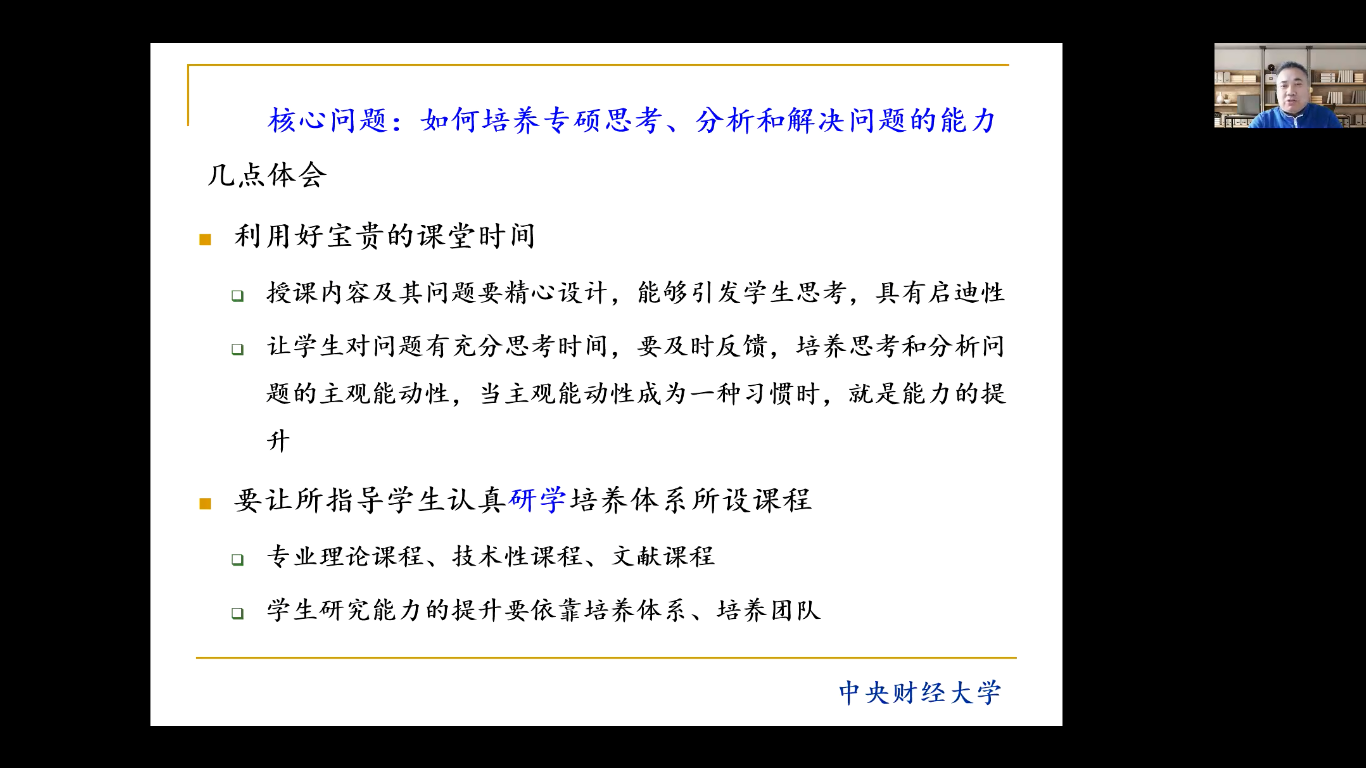 taptap体育翟进步教授对如何培养专硕员工思考、分析和解决问题的能力进行经验分享,提出要利用好宝贵的课堂时间,让员工认真研学培养体系所设课程。在毕业论文的写作方面,着重强调要与员工多进行面对面、一对一的讨论,认真审阅初稿。