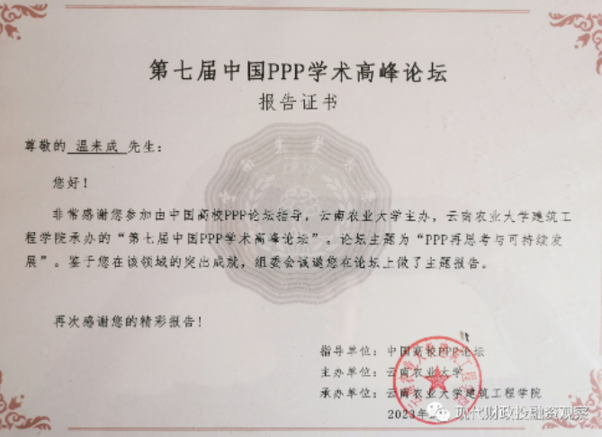 应会议主办方的邀请,公司中财-安融地方财政投融资研究所执行所长、taptap体育教授温来成参加了2023年5月27日-28日由云南农业大学在昆明主办的第七届中国PPP学术高峰论坛。本次论坛的主题为“PPP再思考与可持续发展”。