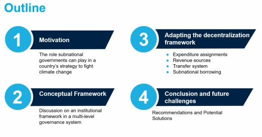 首先,他指出,应对气候变化需要采取更有力和更密切的政府间协调办法。应对气候变化的活动通常基于部门(能源生产、运输部门等)的政策,而没有具体说明哪一级政府将负责管理和实施这些活动的政策和资金。然而,大量温室气体排放来自地方政府行使监管、融资和征税权力的活动(运输、土地使用、建筑、废物等)。因此,了解不同国家的财政分权制度和地方政府应对气候变化的手段至关重要。