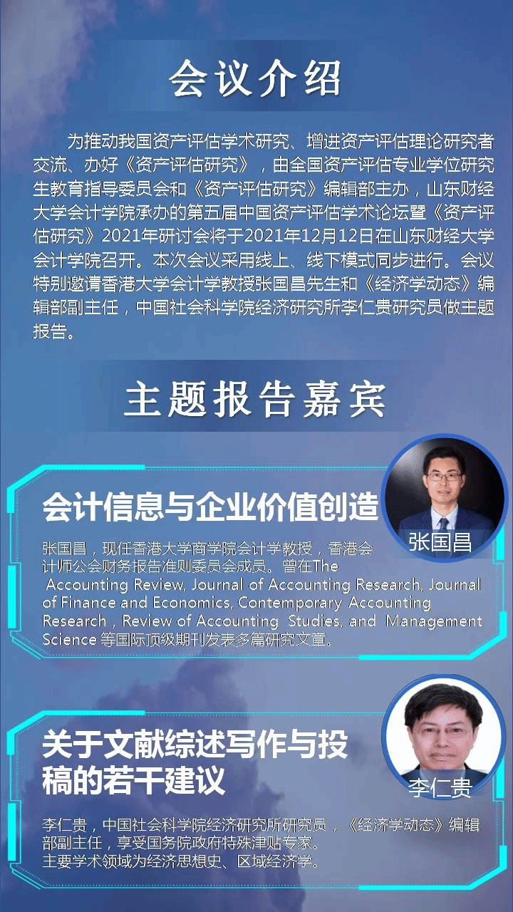 为推动我国资产评估学术研究、增进资产评估理论研究者交流、办好《资产评估研究》,由全国资产评估专业学位研究生教育指导委员会和《资产评估研究》编辑部主办,山东财经大学会计公司承办的第五届中国资产评估学术论坛暨《资产评估研究》2021年研讨会将于2021年12月12日在山东财经大学会计公司召开。本次会议采用线上、线下模式同步进行。