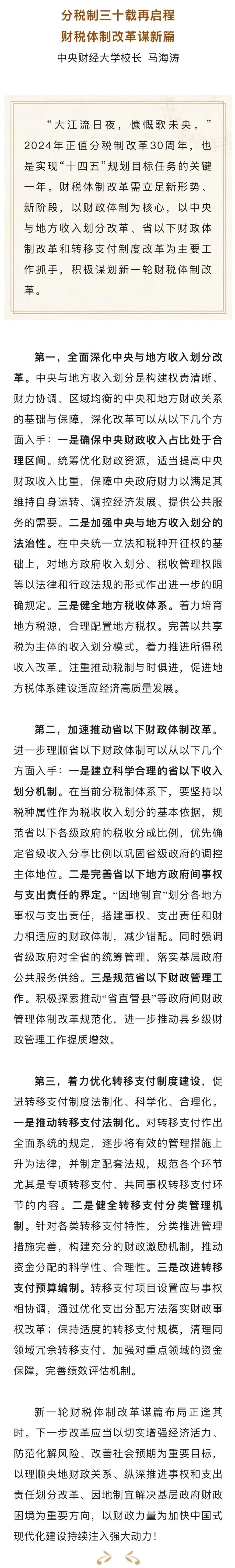 马海涛:分税制三十载再启程 财税体制改革谋新篇