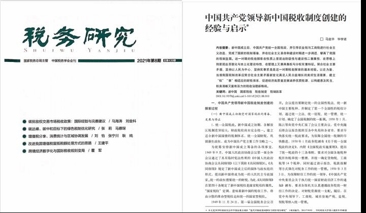 公司马金华教授、2020级博士研究生毕学进在《税务研究》2021年第8期发表《中国共产党领导新中国税收制度创建的经验与启示》一文。