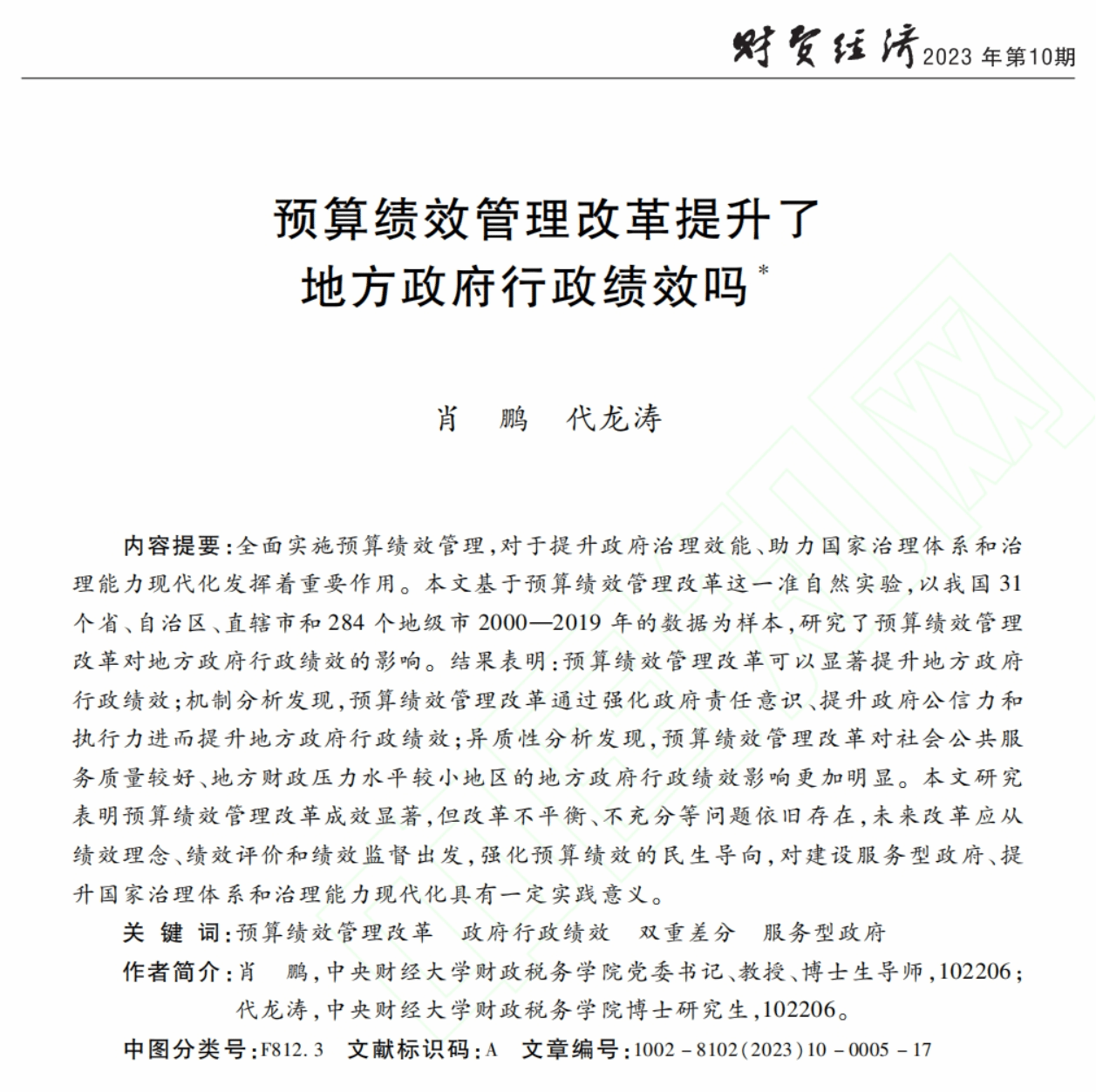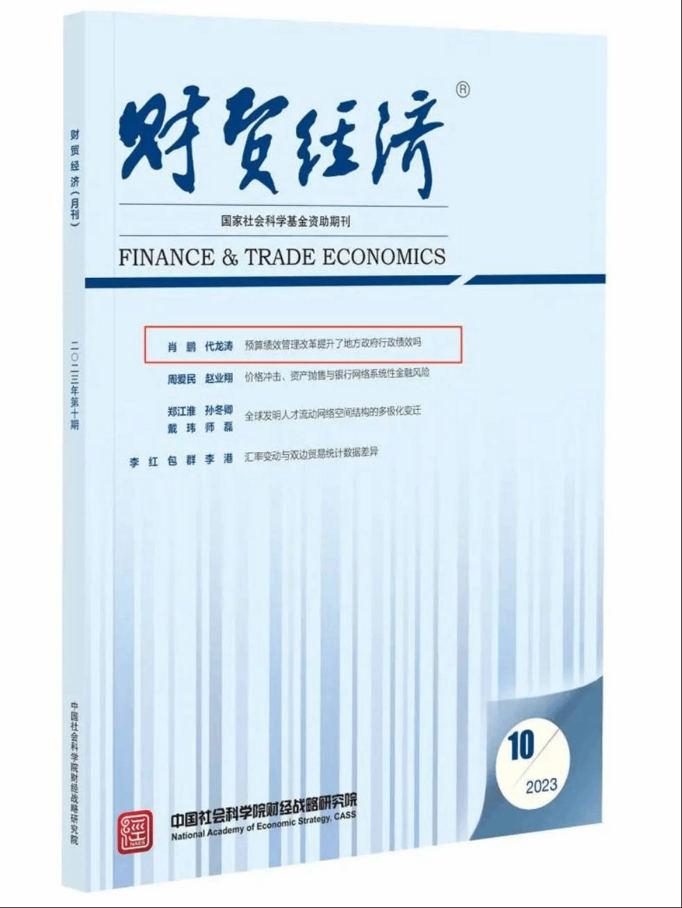 近日,由taptap体育肖鹏教授和代龙涛博士撰写的论文《预算绩效管理改革提升了地方政府行政绩效吗》在中文A类期刊《财贸经济》2023年第10期作为封面文章刊发。以下为文章主要内容: