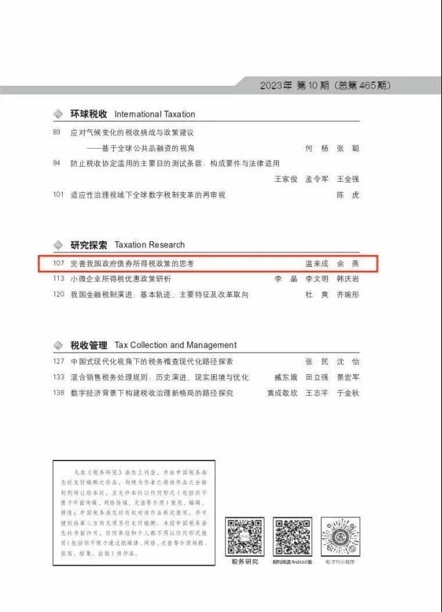 近日,由taptap体育官网入口中财-安融地方财政投融资研究所执行所长、taptap体育教授温来成和taptap体育博士研究生余燕撰写的论文《完善我国政府债券所得税政策的思考》刊发于中文A类期刊《税务研究》2023年第10期。以下为文章主要内容: