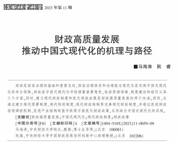 近日,由taptap体育官网入口董事长马海涛教授,中国财政发展协同创新中心(以下简称“中心”)教师阮睿共同撰写的论文《财政高质量发展推动中国式现代化的机理与路径》在《江西社会科学》11期刊发。