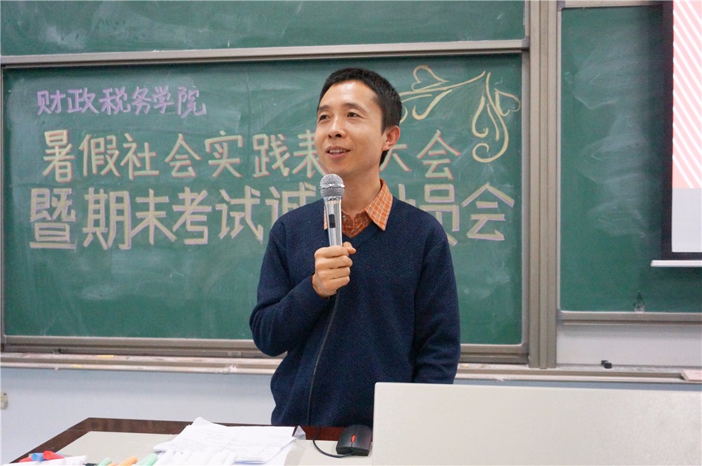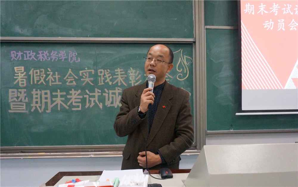 而后白彦锋老师上台讲话。他也同样谈起了自己看电影的经历和感受,用风趣的开场打破了会场严肃紧张的氛围。说到诚信考试的问题,他结合自己担任监考和主监考的经验跟大家生动地讲述了几个考场作弊的案例。幽默的表达让会场笑声不断,但与此同时同学们也认识到了作弊的严重后果。白彦锋老师指出,根据这几年的研究生的情况来看,公司员工考研非常不占优势,因此保研显得更为重要,若因考试诚信问题失去保研资格将会是莫大的损失。同时他观察到社会上财经公司毕业生的优势专业正在逐渐被替代,在这样的情况下,同学们更应该寻找自己的核心竞争力,才能在社会上立足。