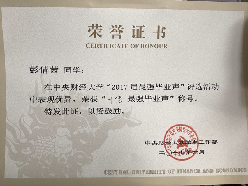 6月13日下午,公司“最强毕业声”评选活动在公司南路校区中财大厦如期举行,公司本科毕业生代表财政13-1班彭倩茜同学通过层层筛选,在最终演讲比赛中荣获“十佳最强毕业声”。