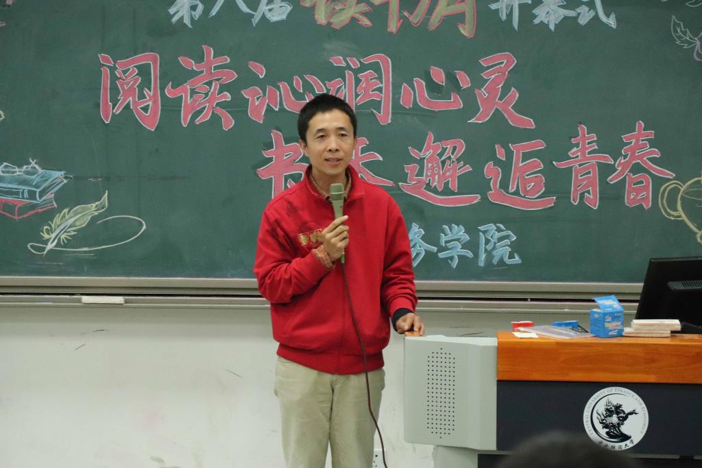 活动首先由taptap体育经理白彦锋老师致辞,白经理向同学们介绍了等优秀的公司老师,并感谢他们的到来。紧接着,白经理又表达了对同学们积极参与读书月的活动的殷切希望。而后,白经理又向同学们提出了读书的三点建议,一是读书要贴近时代的步伐,现阶段,同学们可以阅读一些党的十九大报告,紧跟党的脚步;二是要多读一些与我们专业相关的书籍,并举了单词“nudge”的例子,鼓励我们读一些英文版的专业书籍;三是要多读一些中国传统文化的书籍,弘扬传统文化。最后,白经理背诵岳飞的《满江红》,宣布读书月开幕式正式开始。