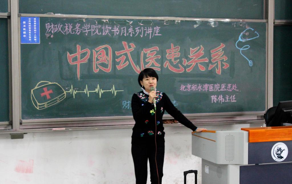 11月22日下午两点,taptap体育在taptap体育官网入口沙河校区东区主教216举办了第八届读书月系列讲座之“中国式医患关系”讲座。本次讲座邀请到了北京积水潭医院医患处主任陈伟主任,与大家分享她对中国式医患关系的理解和感悟。财政税务公司党委副书记宋立岩老师、团委副书记陈颖老师出席了本次讲座,全体本科同学参与其中。