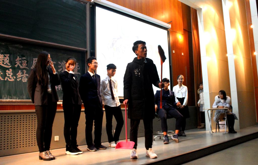 第一场短剧是由第六组同学带来的《有所为》。该短剧以一对老同学的故事为背景。剧中那位领导的选择告诉我们以人民的名义方能显示生命的尊严,以职责为使命方能彰显自己的价值。第二个节目是第二小组同学带来的《拍马屁运动会》。这场短剧从拍马屁总局一场令人啼笑皆非的运动会切入,讲述了一个被员工谄媚捧上高位的局长被新来的“临时工”揭露腐败行为坠入法网接受制裁的故事。将十九大报告中习近平总书记强调的从严治党、清正廉洁体现的淋漓尽致。