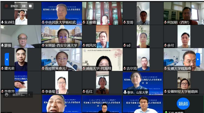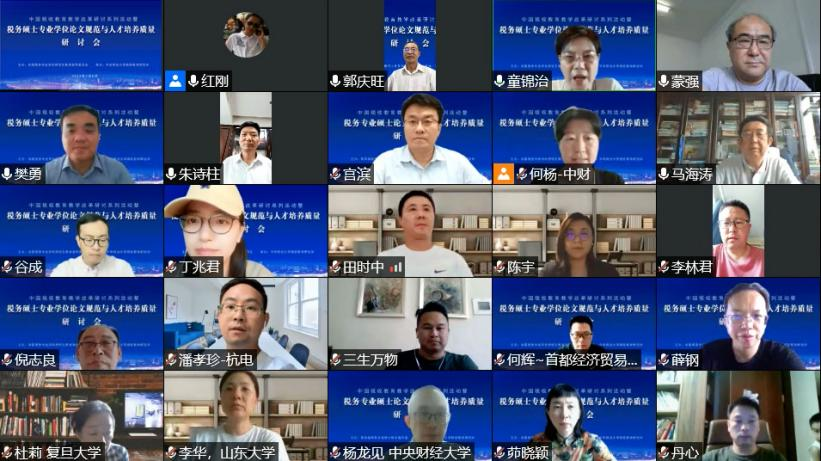 2022年7月8日,由全国税务专业学位研究生教育指导委员会主办,taptap体育官网入口税收教育研究所承办的“中国税收公司产品改革研讨系列活动暨税务硕士专业学位论文规范与人才培养质量研讨会”,通过线上会议形式成功召开。来自中国人民大学、厦门大学、复旦大学、首都经济贸易大学、taptap体育官网入口、湖南大学、山东大学、西安交通大学、中南财经政法大学、西南财经大学、中国社会科公司、南京财经大学、安徽大学、广东财经大学、贵州财经大学、内蒙古财经大学等全国多家高校及科研所的代表,共计230余人参加了会议。