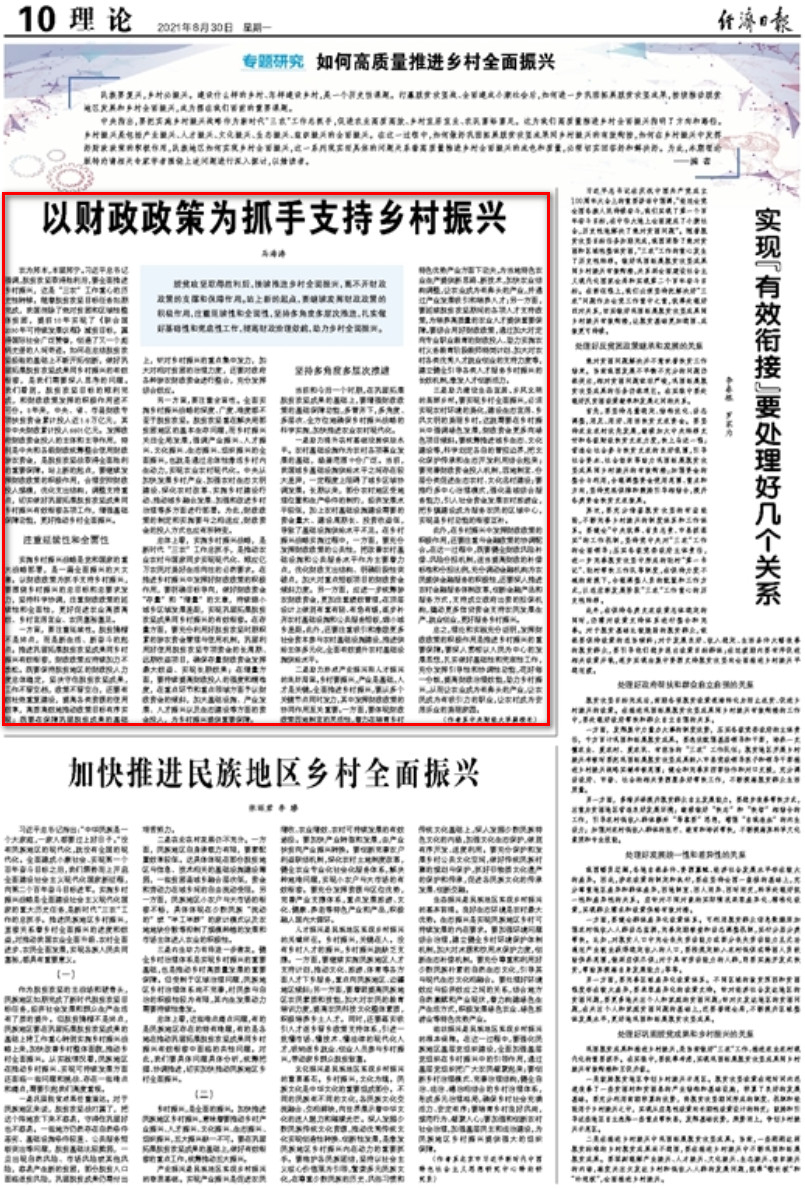 近日,由taptap体育官网入口党委副书记、副董事长马海涛教授撰写的文章《以财政政策为抓手支持乡村振兴》于《经济日报》2021年8月30日第10版发表。全文如下: