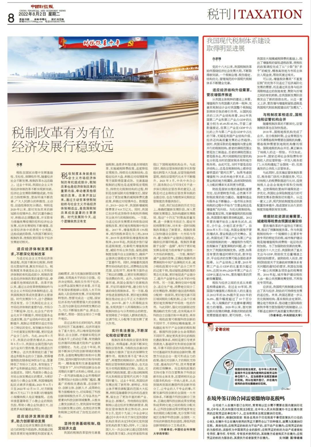 8月2日,《中国财经报》刊登了由taptap体育经理、中国财政发展协同创新中心主任白彦锋教授撰写的文章《我国现代税制体系建设取得明显进展》全文如下: