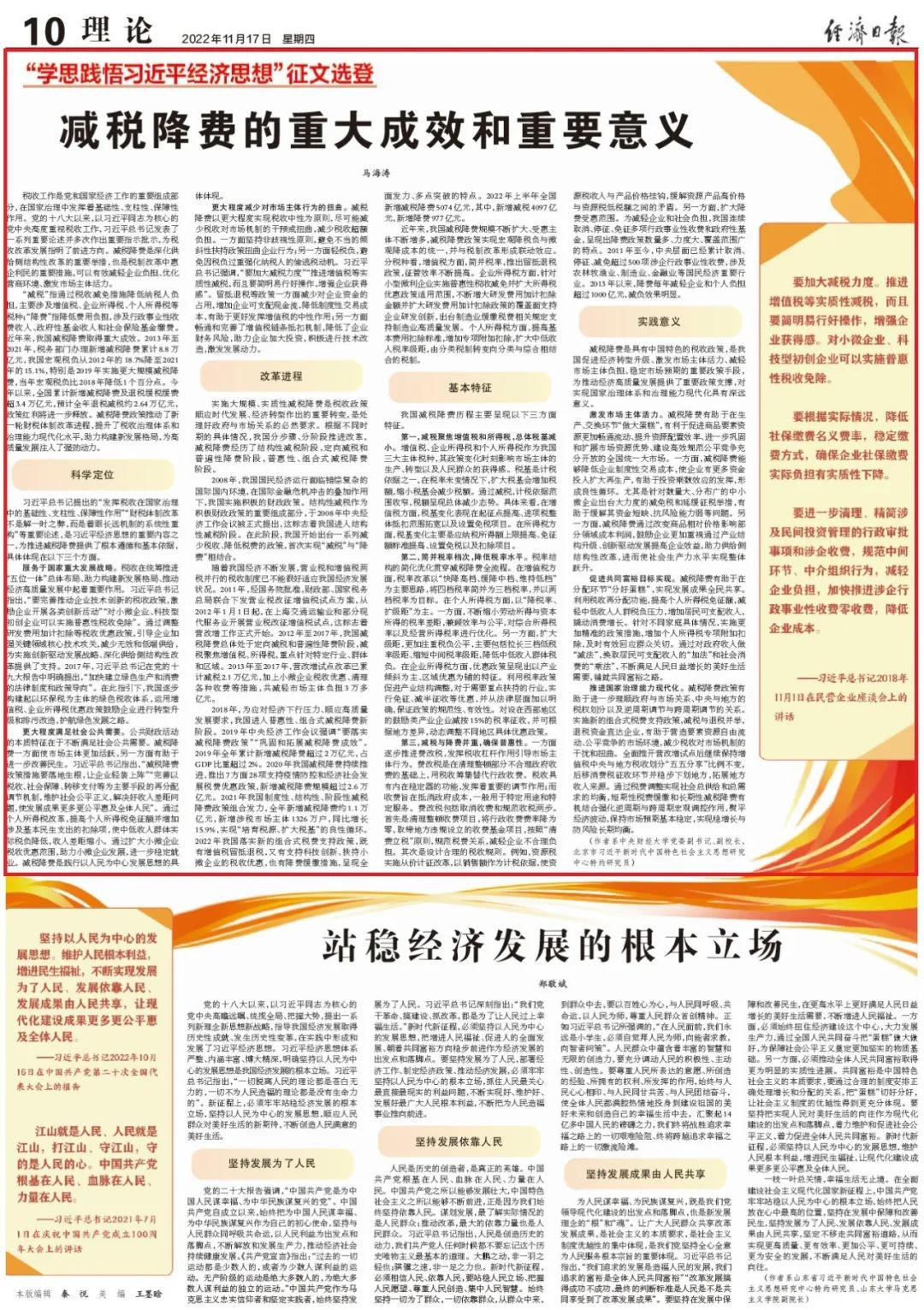 习近平总书记提出的“发挥税收在国家治理中的基础性、支柱性、保障性作用”“财税体制改革不是解一时之弊,而是着眼长远机制的系统性重构”等重要论述,是习近平经济思想的重要内容之一,为推进减税降费提供了根本遵循和基本依据,具体体现在以下三个方面。