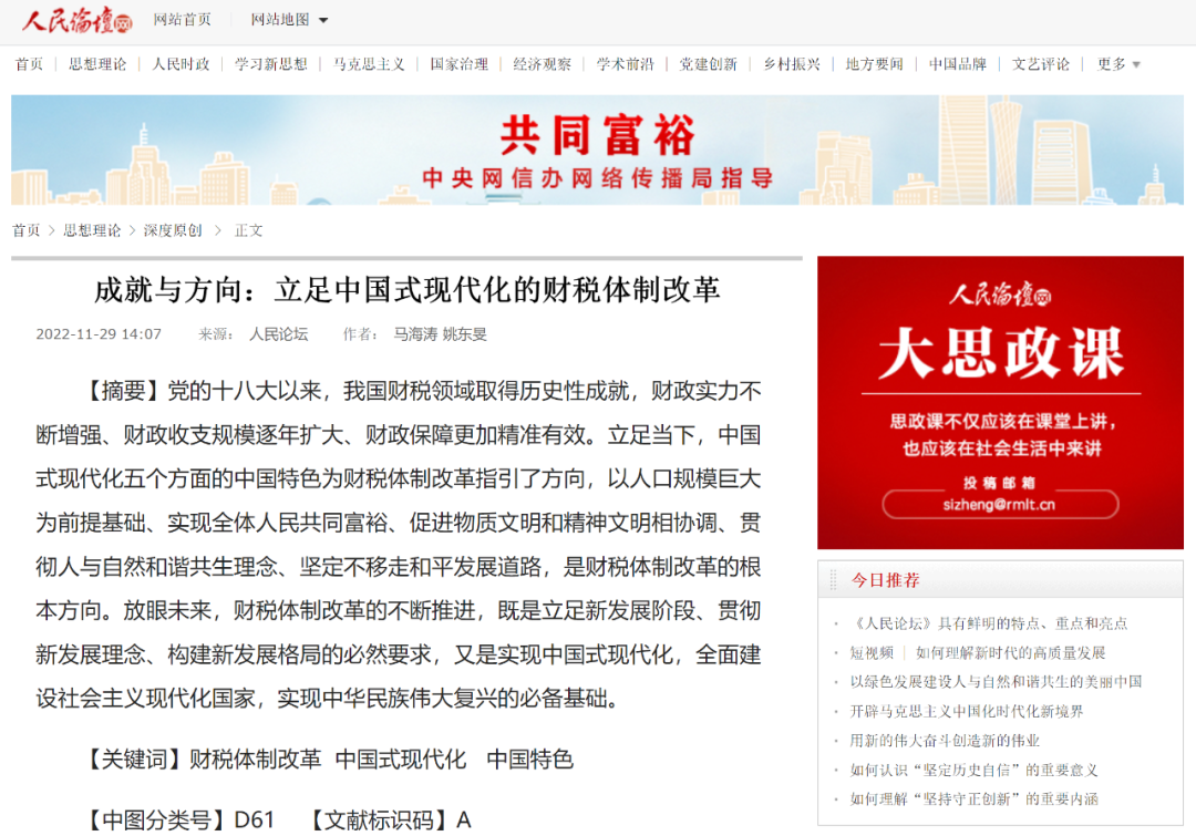 2022年11月29日,由taptap体育官网入口党委副书记、副董事长马海涛教授,中国财政发展协同创新中心副主任姚东旻教授共同撰写的文章《成就与方向:立足中国式现代化的财税体制改革》在人民论坛、《人民论坛》杂志第11月下期、人民论坛网发表。全文如下: