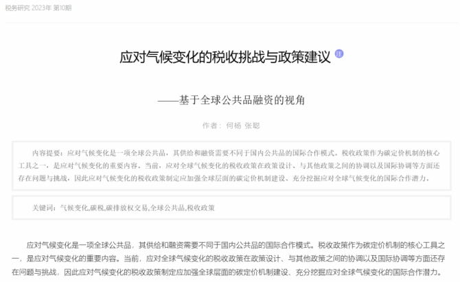 近日,由taptap体育何杨教授和张聪博士撰写的论文《应对气候变化的税收挑战与政策建议——基于全球公共品融资的视角》在中文A类期刊《税务研究》2023年第10期录用刊发。以下为文章主要内容。